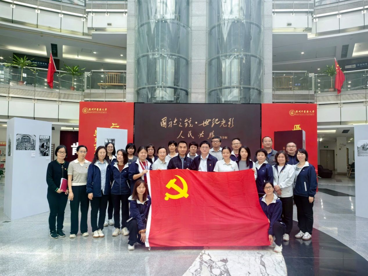 学习结束后,党员们集体参观了由新华社主办的“国社之镜・世纪光影之人民必胜”图片巡展广州中医药大学专场。此次展览通过展示170余幅珍贵的历史照片,以中国战场为核心视角,系统呈现了波澜壮阔的抗战全景图。其中,不仅有学校选送的广东抗战相关珍贵图片,还有国医大师邓铁涛教授的珍贵影像资料。这些资料生动见证了中医药学子在民族危难时刻挺身而出的责任担当,展现了医者仁心投身国难的精神风貌,成为广中医人践行“上医医国,先觉觉民” 和“厚德博学,精诚济世”校训精神的有力佐证。