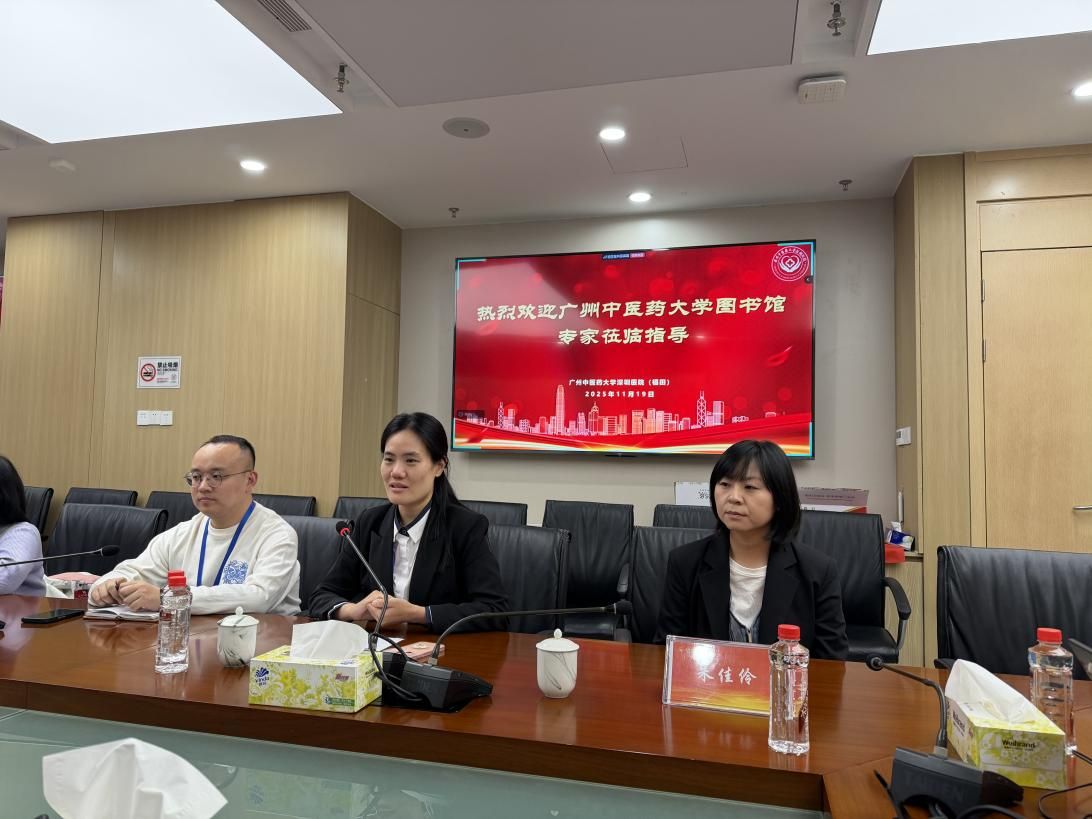 为更好满足我校教学医院医护人员及学生的文献信息资源及信息检索需求,推广我校图书馆数字资源的利用,助力教学医院医疗、教学、科研协同开展,2025年11月19日,图书馆潘伟增馆长率学科馆员团队一行4人,应邀赴广州中医药大学深圳医院(福田)(广州中医药大学第六临床医学院)开展数据库专题培训讲座。培训以线上线下相结合的方式同步进行,广州中医药大学深圳医院王南卜副院长、科教部雷雨禾副主任,以及来自各科室的医护人员、科研人员等共60余人参与培训。