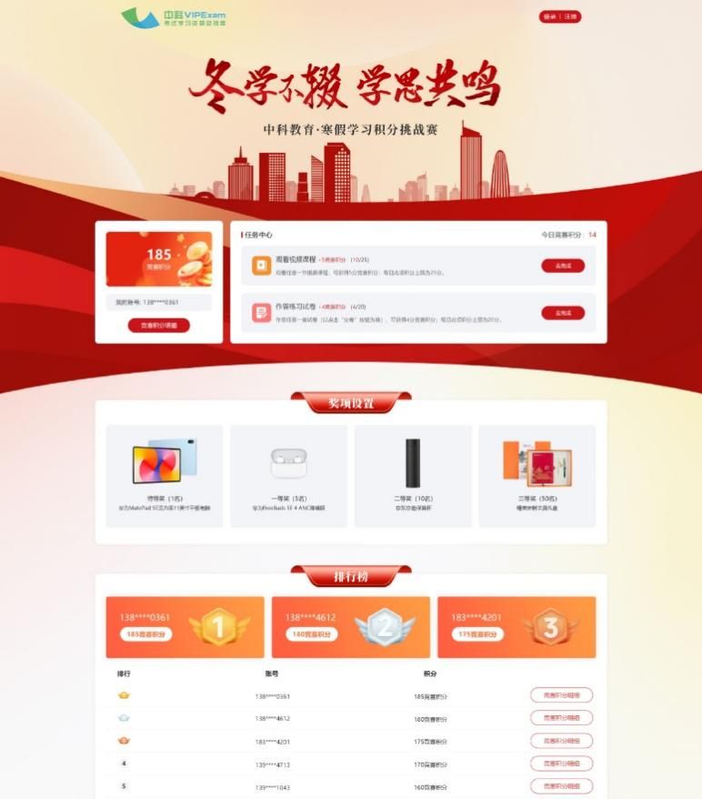 参赛者在“中科VIPExam考试库”内观看视频课程、作答试卷,即可获得“竞赛积分”。
