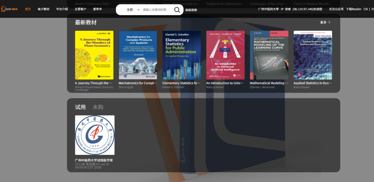访问入口:从平台首页下方选择“试用”栏目,可以查看所有的试用资源库,点击图标直接进入相关教材列表页;